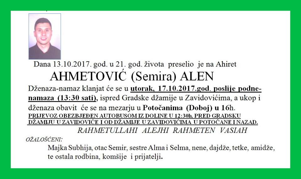 U utorak 17.10.2017. god. u 13:30 sati poslije podne namaza, ispred gradske đzamije u Zavidovićima bit će klanjana dženaza namaz Alenu Ahmetoviću, 21-godišnjem mladiću iz mjesta Alići kod Zavidovića, koji je smrtno stradao u petak 13. Oktobra u Beogradu.